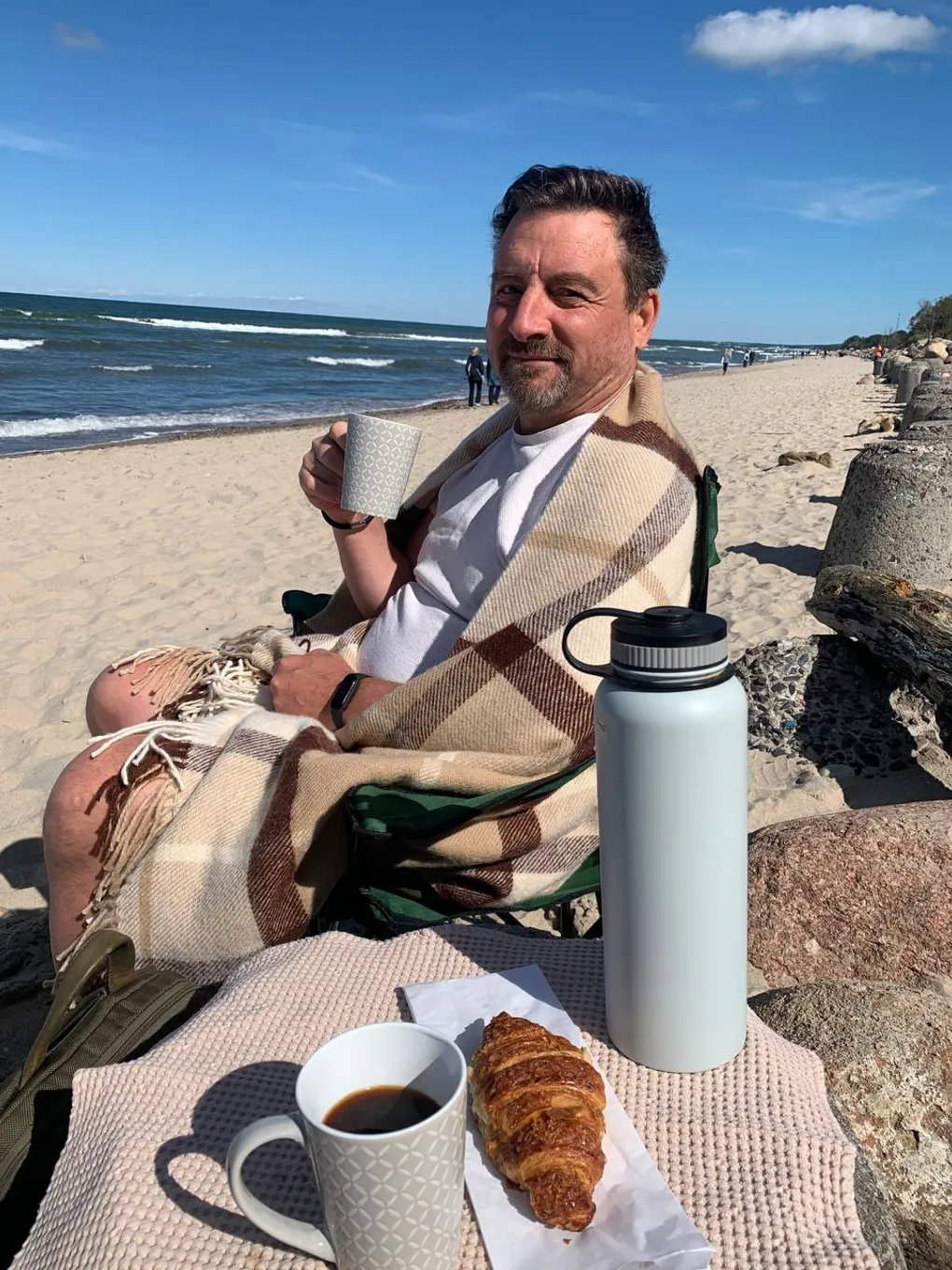 От дома до берега 10 минут пешком через кофейню. Мы берём книги, складные стулья, пледы. По пути наполняем термос кофем.
