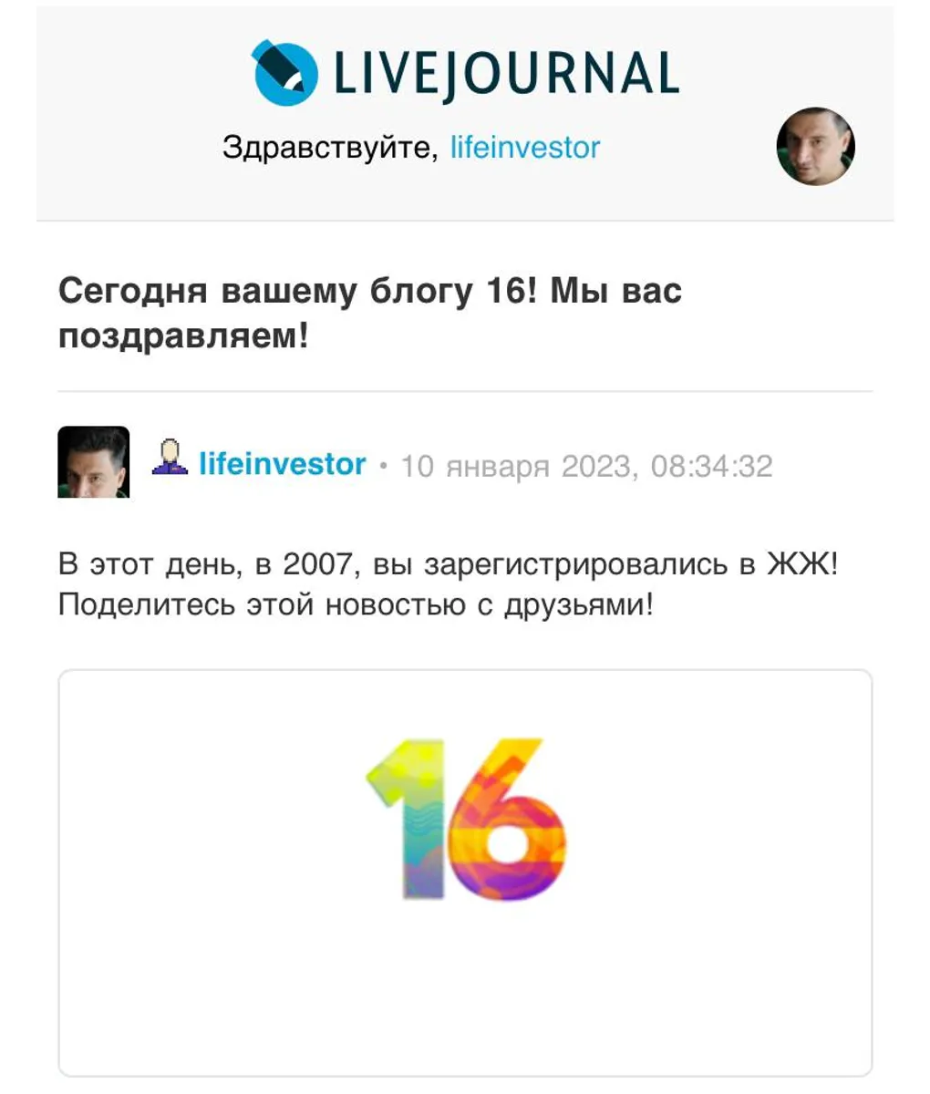 Поделиться статьей x Скопировать ссылку Telegram SMS Email Вид текста x - Размер шрифта + - Межстрочный интервал + - Поля по бокам + В этом году аккаунт в Живом Журнале исполнилось 16 лет 20 янв. 2023 г. Это репост из Telegram 20 янв. 2023 г. В этом году аккаунт в Живом Журнале исполнилось 16 лет