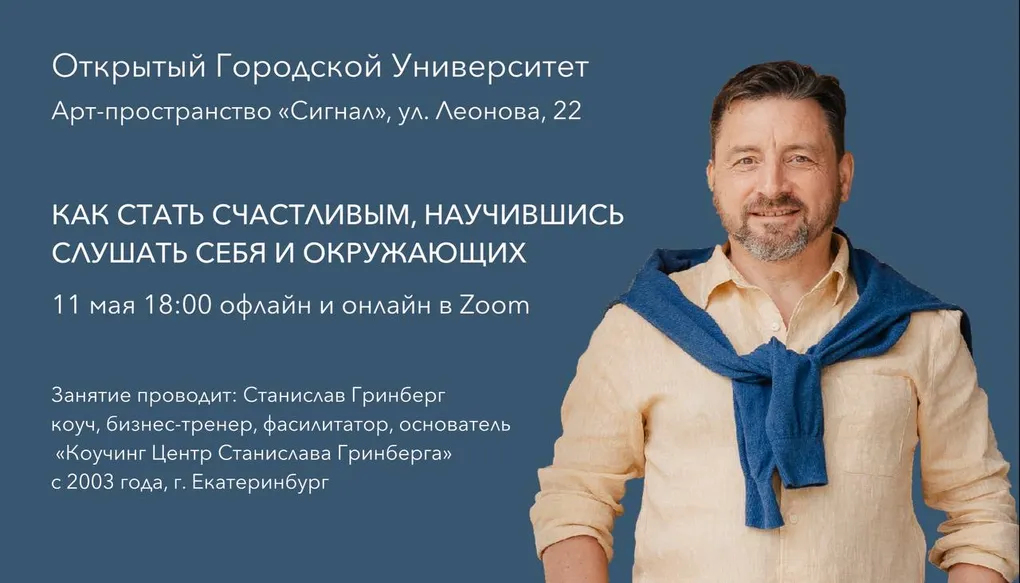11 мая / четверг / в 18:00 в «Сигнале» на Леонова 22 в Калининграде (и онлайн формат в Zoom) Городской Университет приглашает всех желающих на **практикум: «Как стать счастливым, научившись слушать себя и окружающих людей».**Занятие проводит Станислав Гринберг — коуч, бизнес-тренер, основатель «Коучинг Центра Станислава Гринберга».