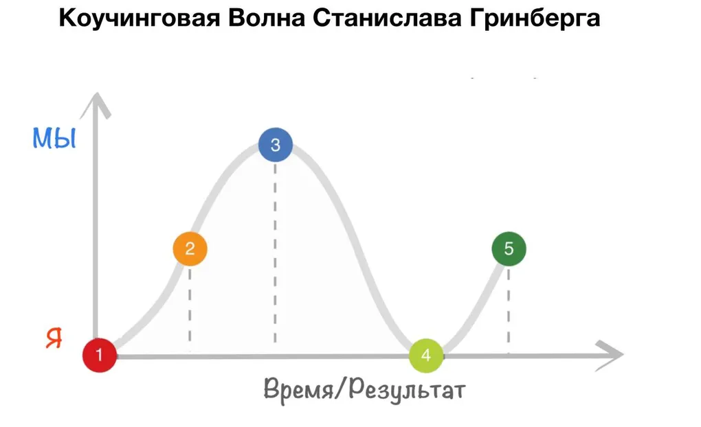 И дал название - «Коучинговая Волна Станислава Гринберга». Назвал так, чтоб никто не спрашивал где я про это узнал. А слово «Волна», родилось из того, что у каждого автора, в нашей профессии, должна быть какая-то фигура. Картман выбрал Треугольник. Маслоу и Дилтц выбрали Пирамиду. Я выбрал Волну.
