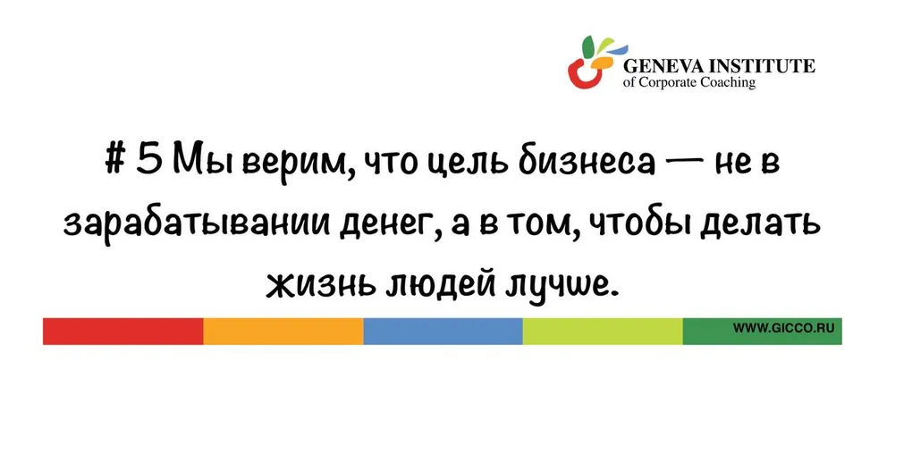 Так родился проект «Женевский Институт Командного Коучинга», в котором я обучал проведению командной коуч-сессии по авторской методике. А также заложил ценностный и мировоззренческий контекст. Он начинался с этих пунктов: